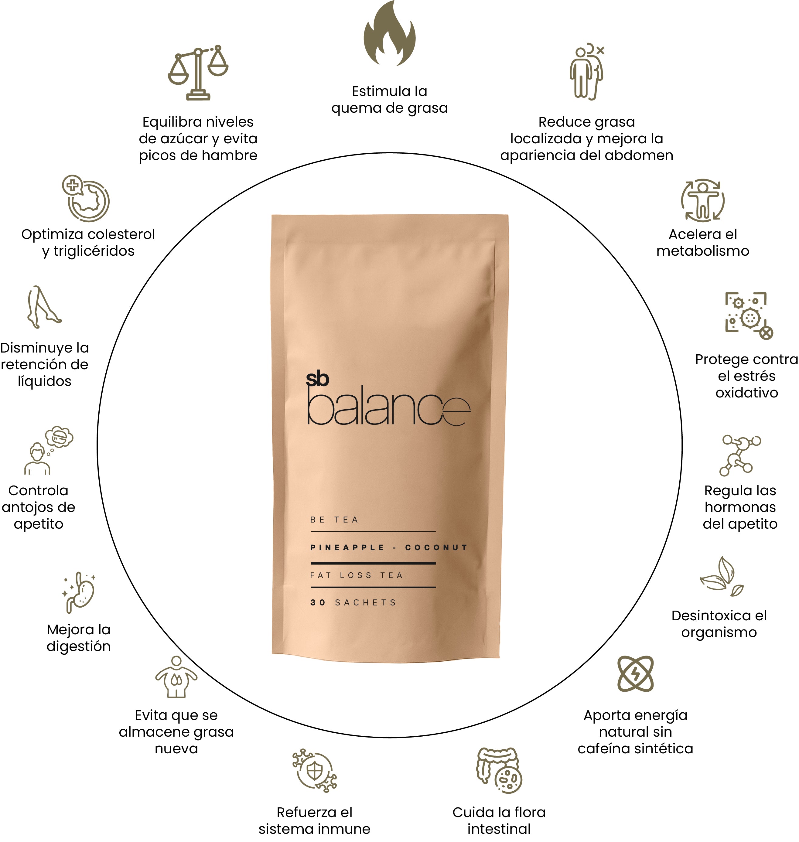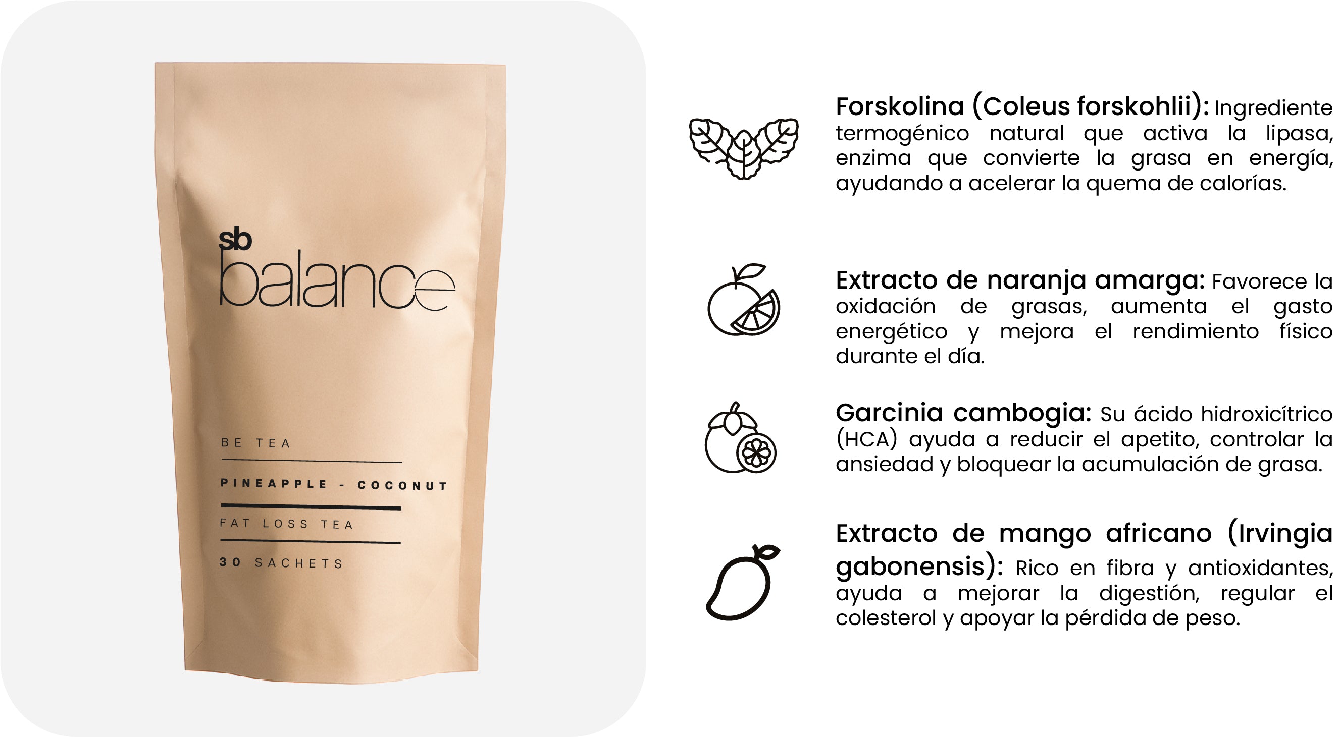 SB Balance Be Tea es el té quemador de grasa sabor piña-coco que combina forskolina, garcinia, mango africano y extracto de naranja amarga. Una fórmula natural que acelera el metabolismo, reduce medidas y te ayuda a alcanzar tu peso ideal.