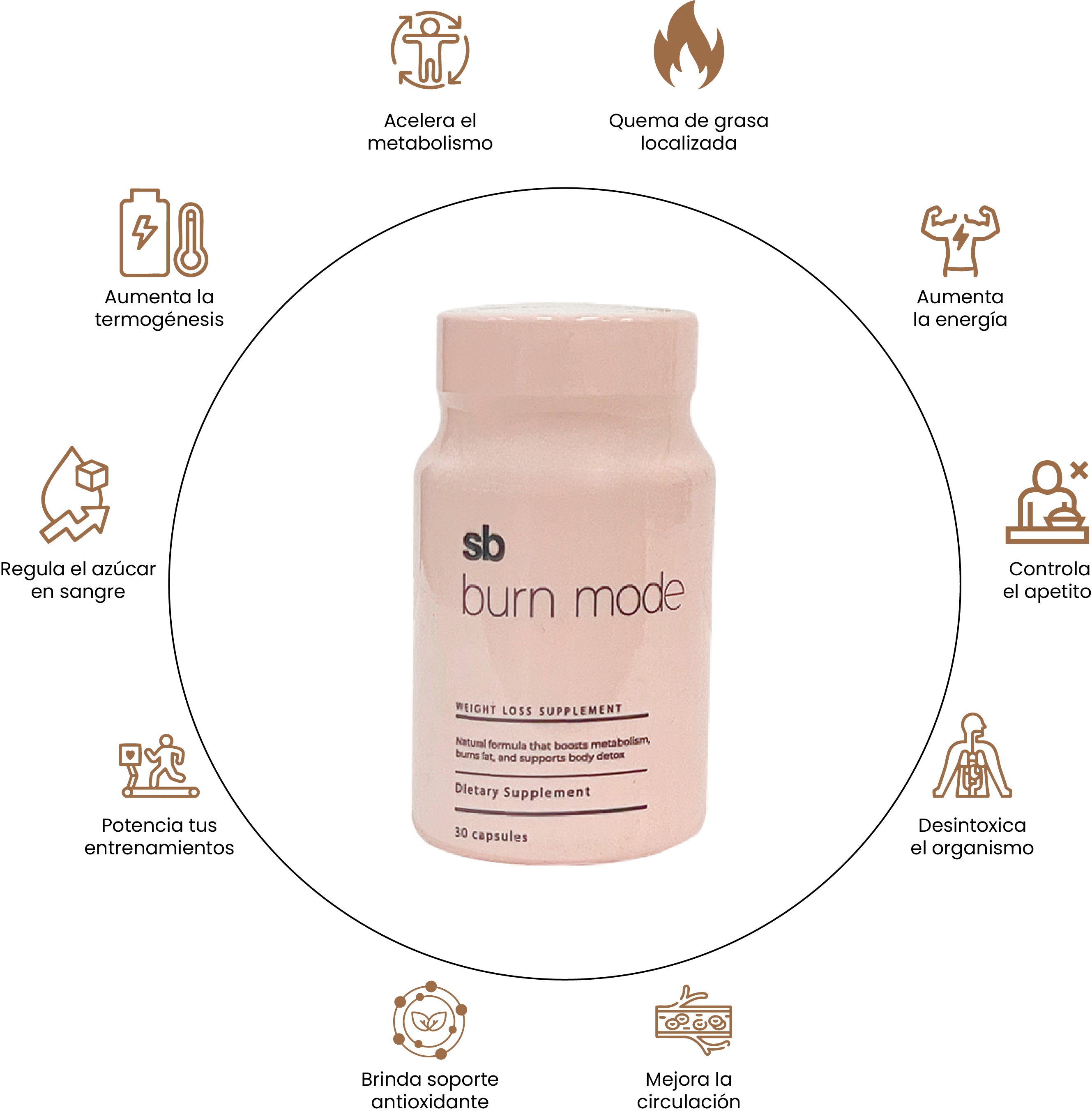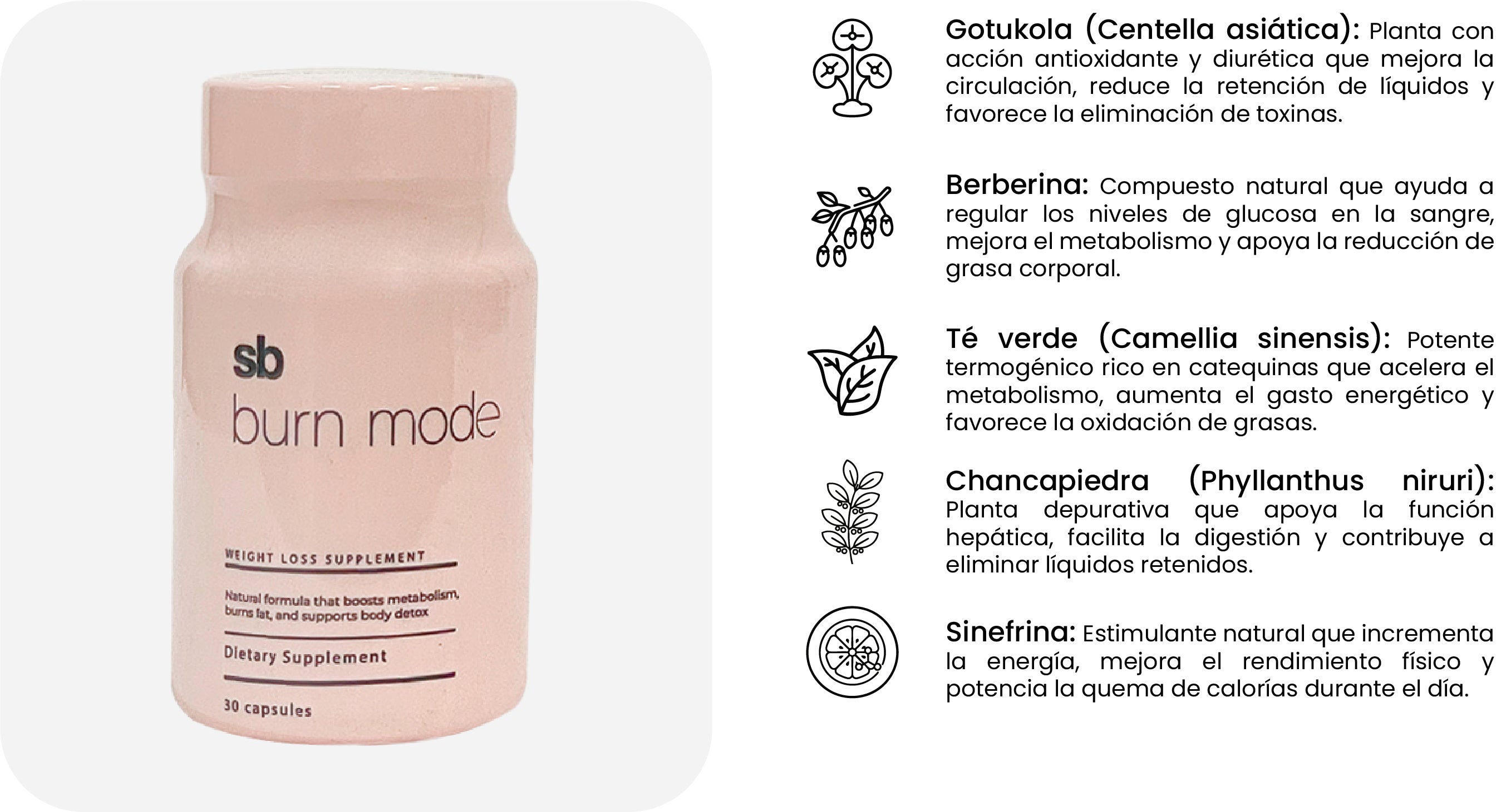 SB Balance Burn Mode es el suplemento que activa tu metabolismo y acelera la quema de grasa desde el primer día. Diseñado para ayudarte a reducir medidas, controlar el apetito y mantener altos niveles de energía, es el aliado ideal para transformar tu cuerpo de manera natural y efectiva.